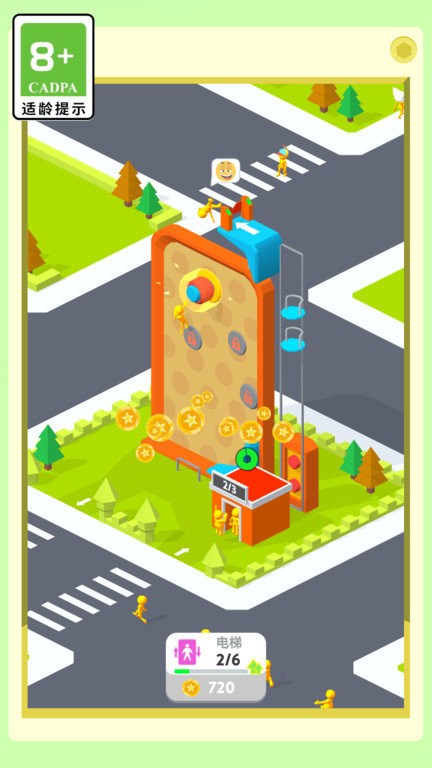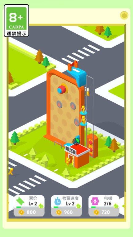 3、屏幕底部设有临时加速等道具,收集后立即生效。通过右上角菜单可使用游戏币提升电梯载客量或运行效率。