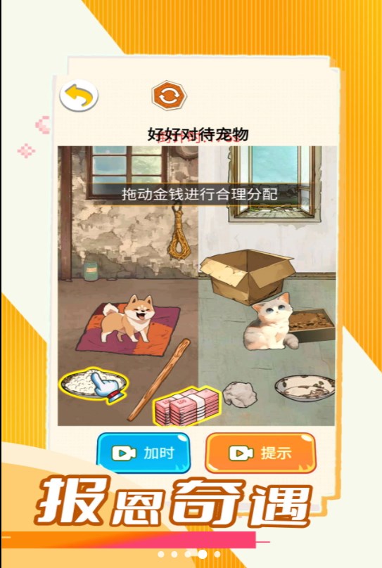 报恩奇遇官方安卓版这款属于休闲益智类手机游戏,游戏简单易操作,游戏玩家可以简单入门,游戏玩法也是十分的有趣,丰富多彩的游戏感受,也有许多的趣味性的动画场景等候着用户的挑战。当前的版本是v1.0,根据用户的反馈,优化了游戏的一些画面和相关操作,有兴趣的小伙伴们一定不能错过了哦,赶紧来下载游戏一起畅玩吧!
